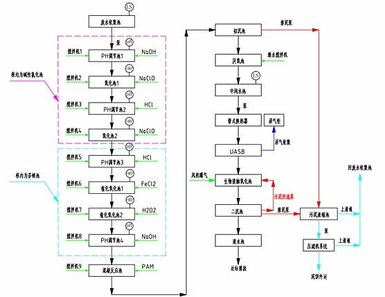 污水先PH調(diào)節(jié)池,然后在經(jīng)過氧化池,這樣來回的重復幾個流程,在進入PAM反應池,然后經(jīng)過沉淀,使排放出去的水能夠達標。其具體的流程圖如下。